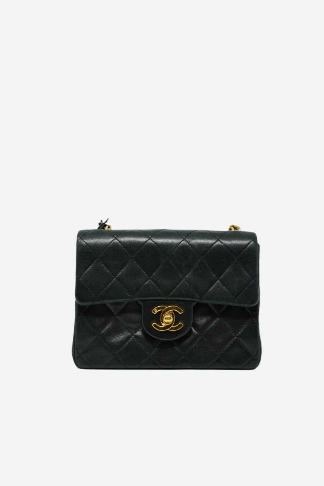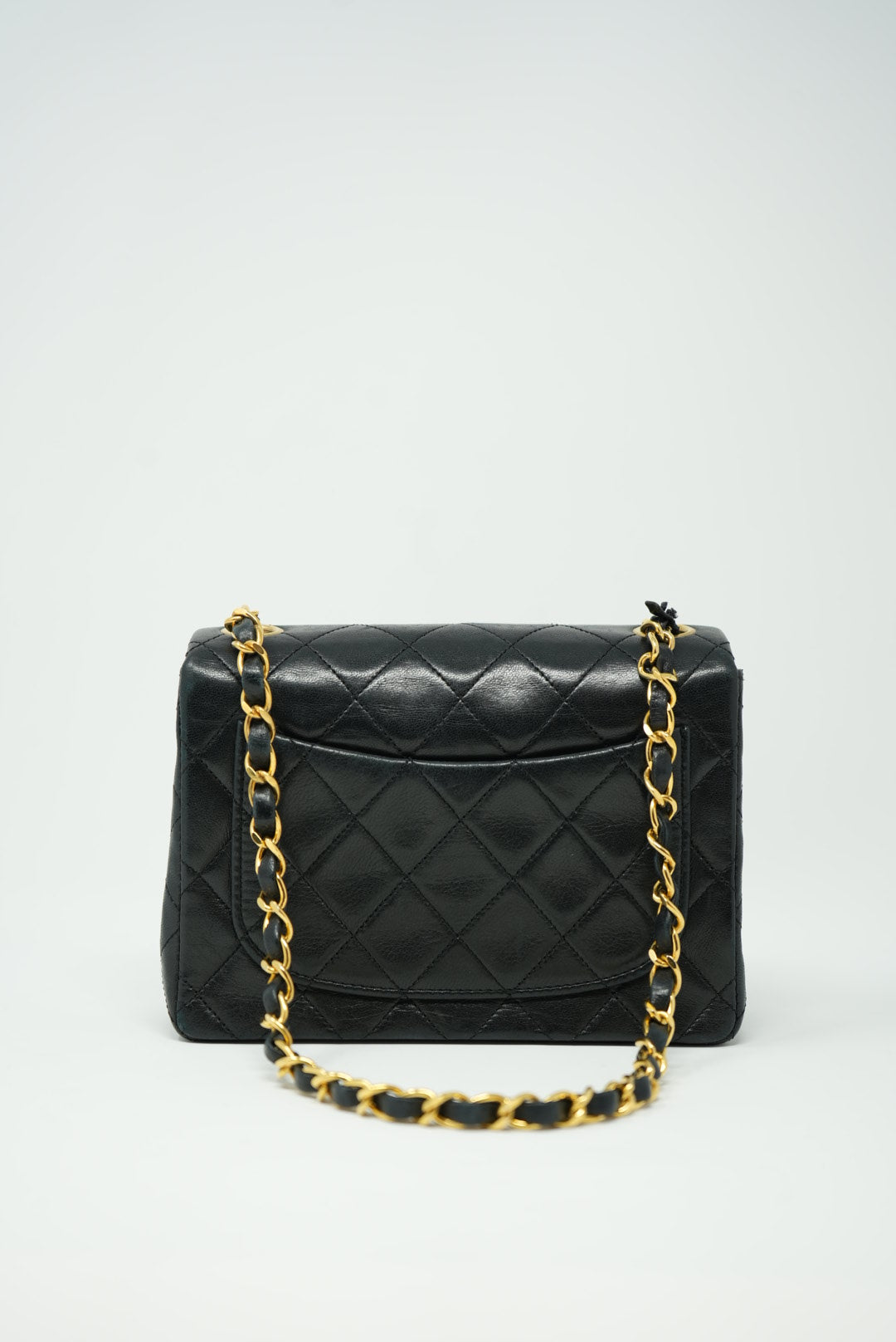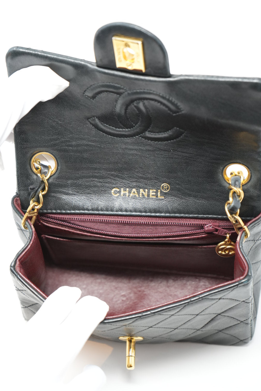 Pre-Owned Chanel 1989-1991 Mini Square Short Chain HandBag Black Lambskin