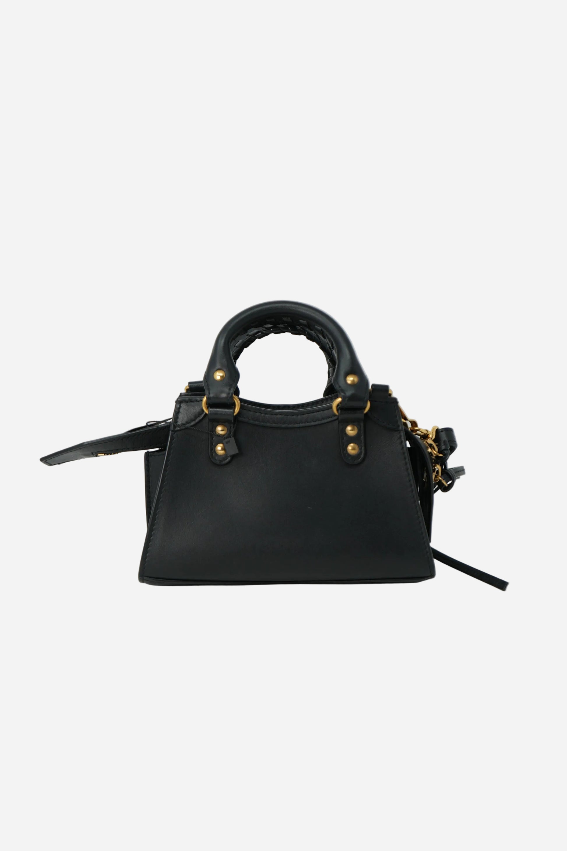 Discover the Balenciaga Mini Neo Classic City crossbody bag in black calfskin leather, featuring a compact silhouette with top handles and a detachable shoulder strap. Designed for everyday wear, the bag is in good condition with normal signs of daily use, and the interior remains clean. This piece includes an Entrupy Certificate of Authenticity.