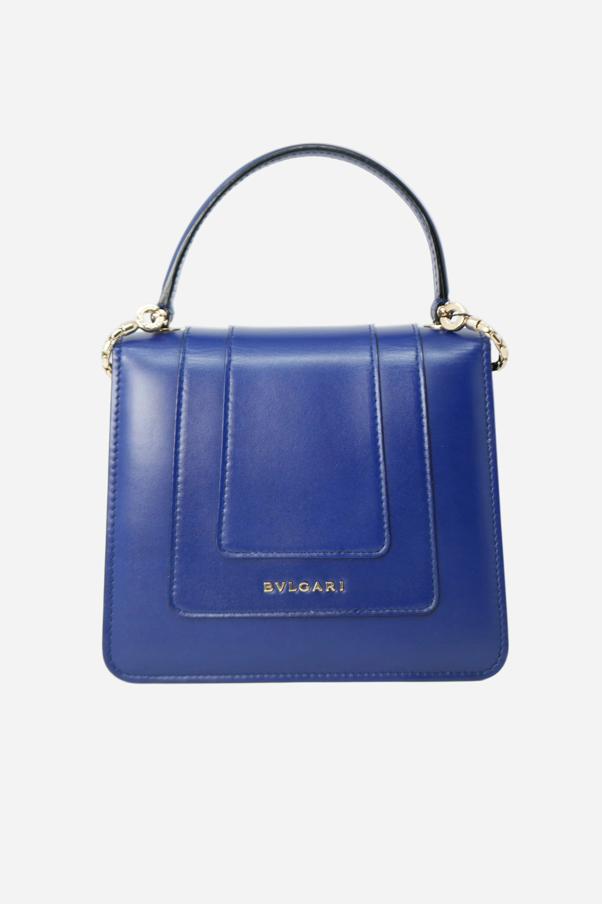 Discover the Bvlgari Serpenti Forever top handle bag in blue calfskin leather, featuring a structured silhouette with a top handle and detachable strap. The bag is in good condition with normal signs of use, and the interior remains clean.
