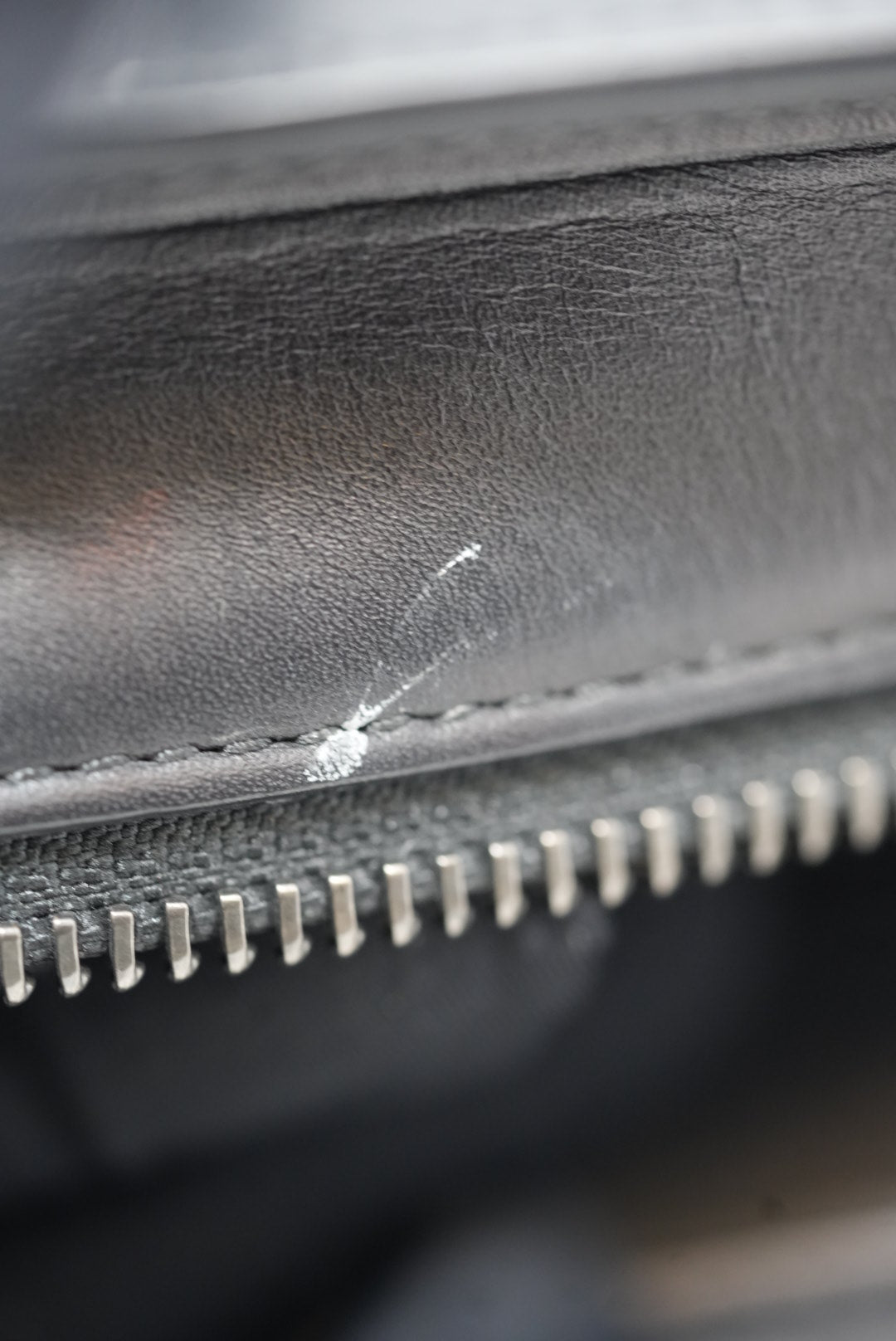 Outside | Good condition, the bottom, the handle, and the strap have scratches, the side of the bag has stains, and the zipper has white stains as shown in pictures. |