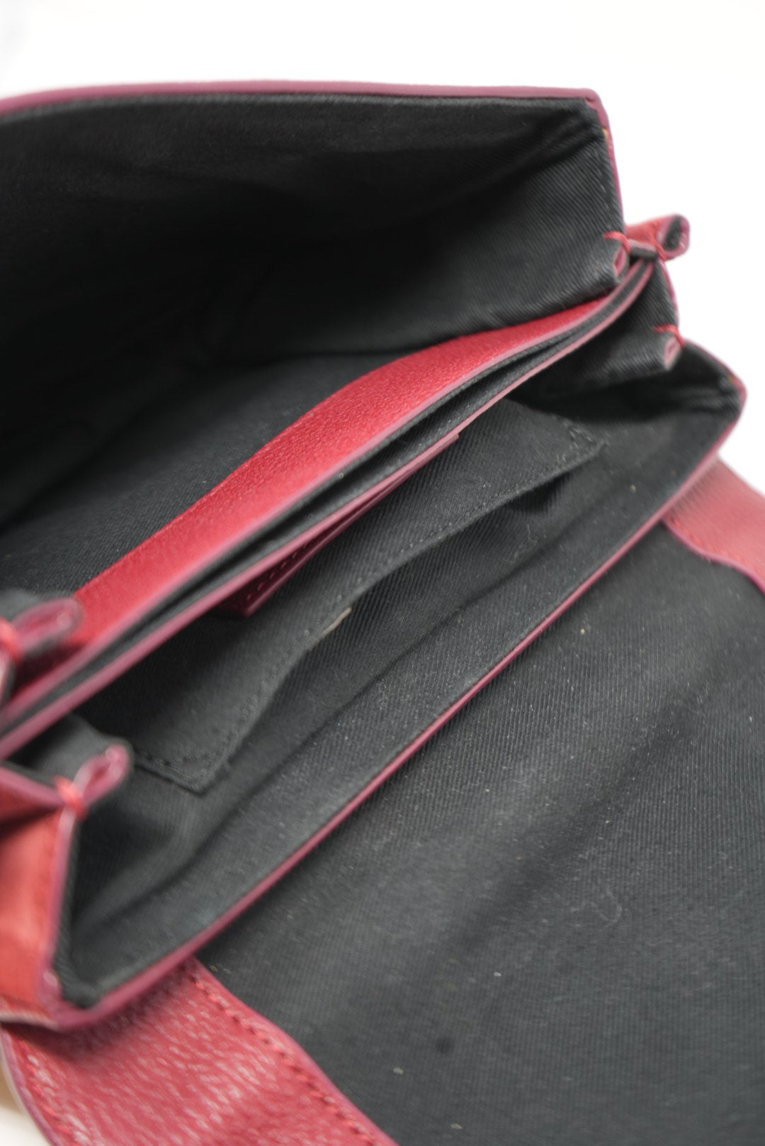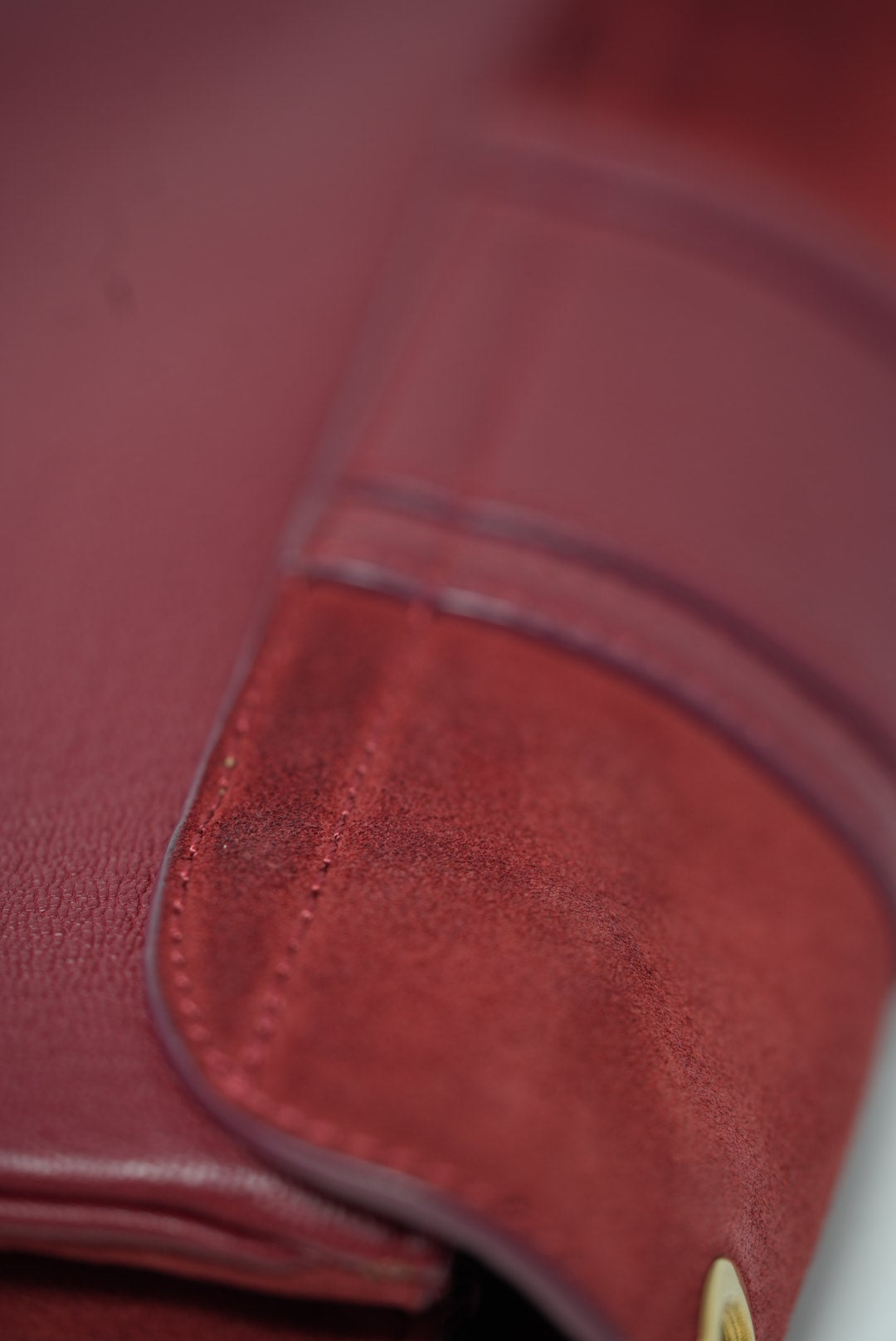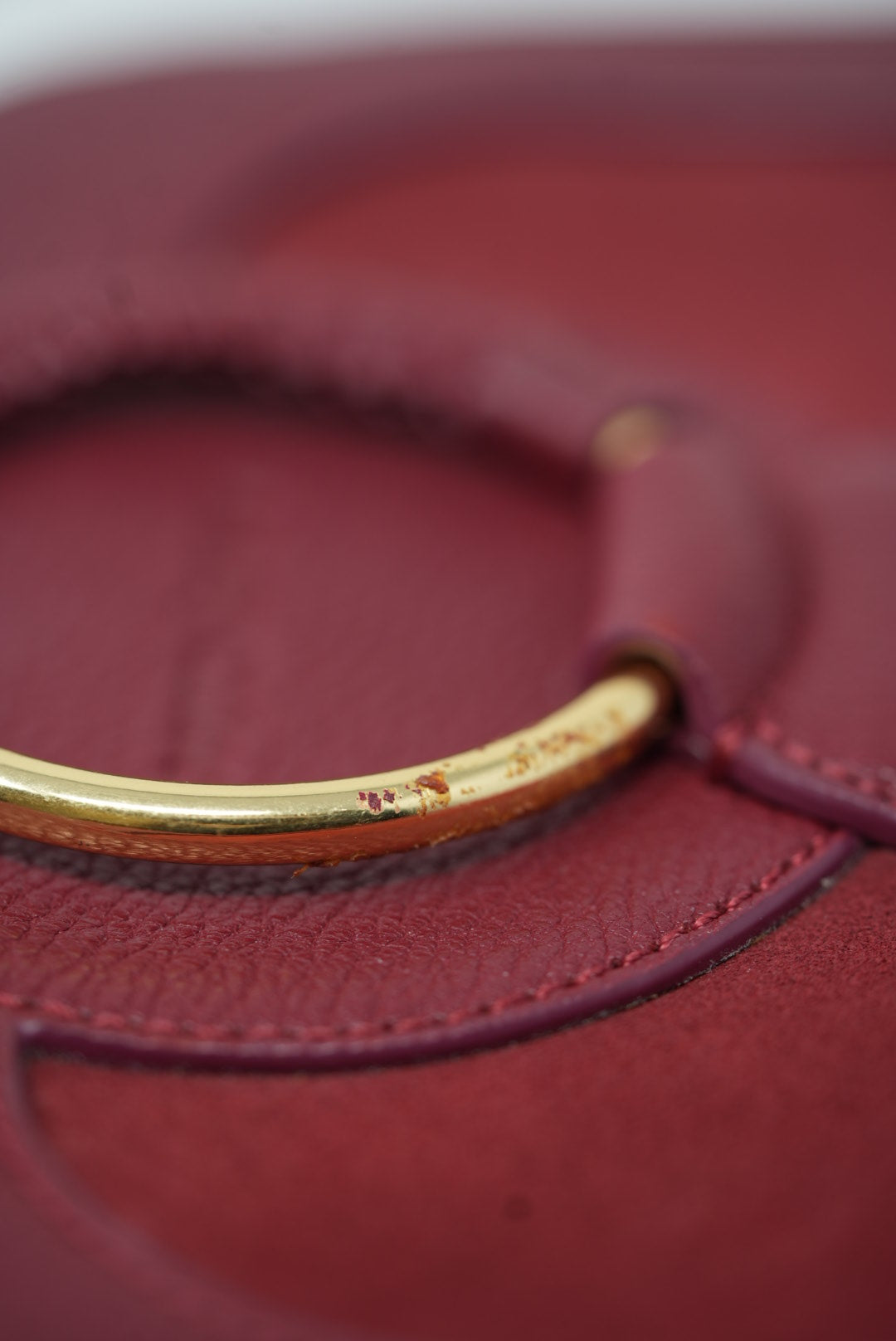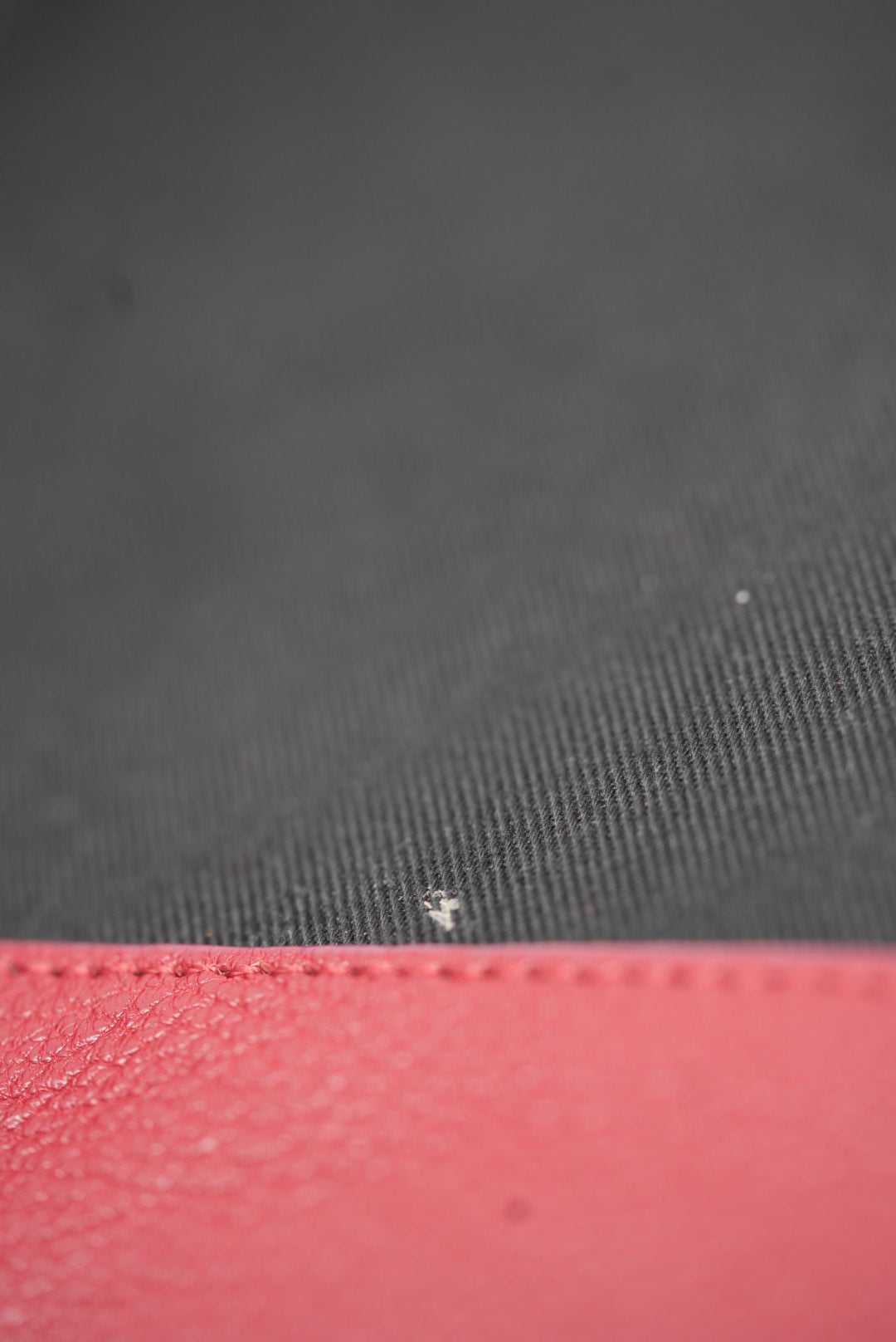 Outside | Good condition, the inside flap has minor stains, the hardware circle has red stains, and the hardware and back of the bag have scratches shown in picture |