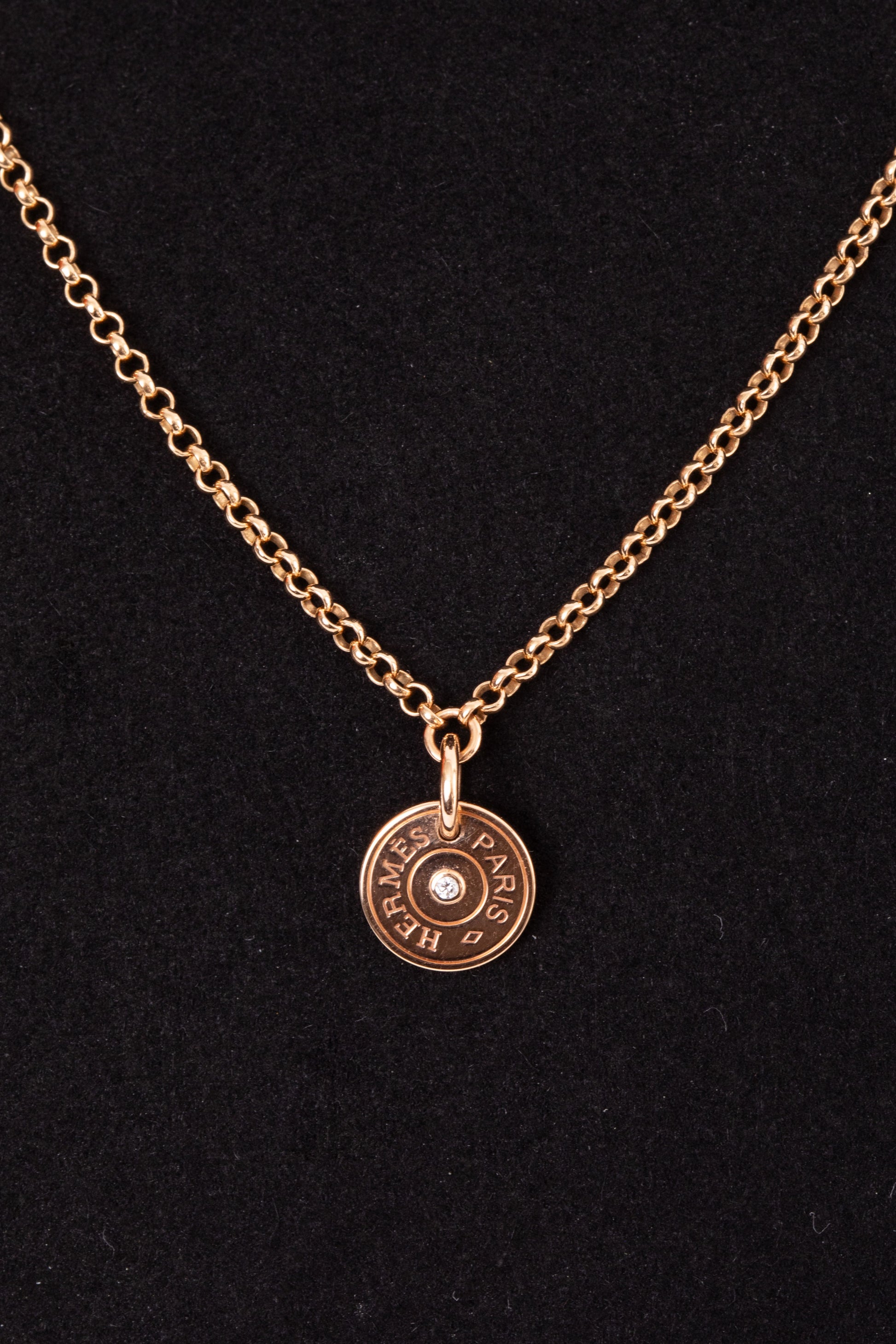 Discover the Hermès Ex-Libris pendant necklace from 2019, crafted in 18K rose gold and set with diamonds, featuring a refined and iconic design. The necklace is in excellent pre-loved condition with only minor signs of use. This piece comes with the original box and certificate.