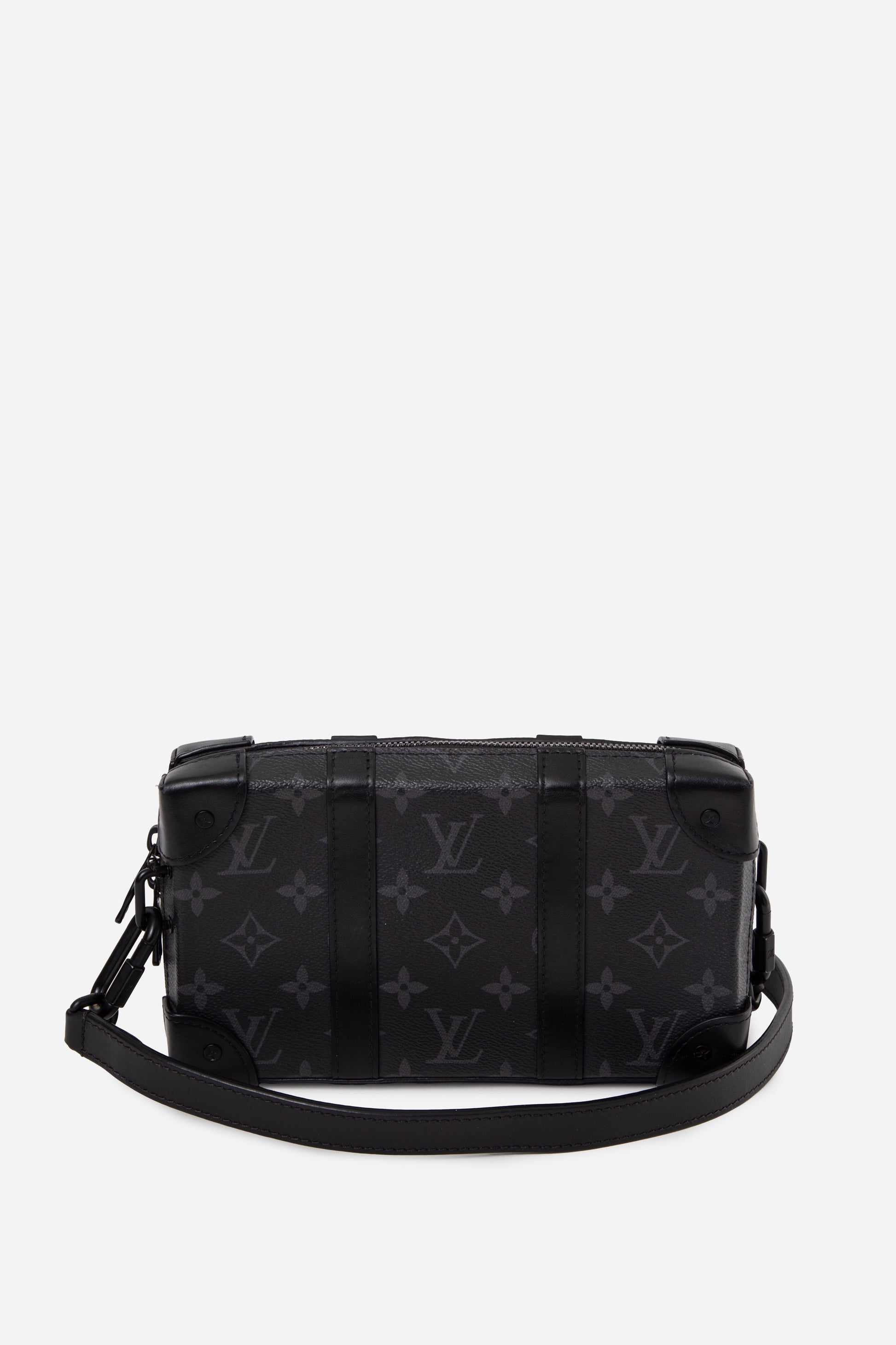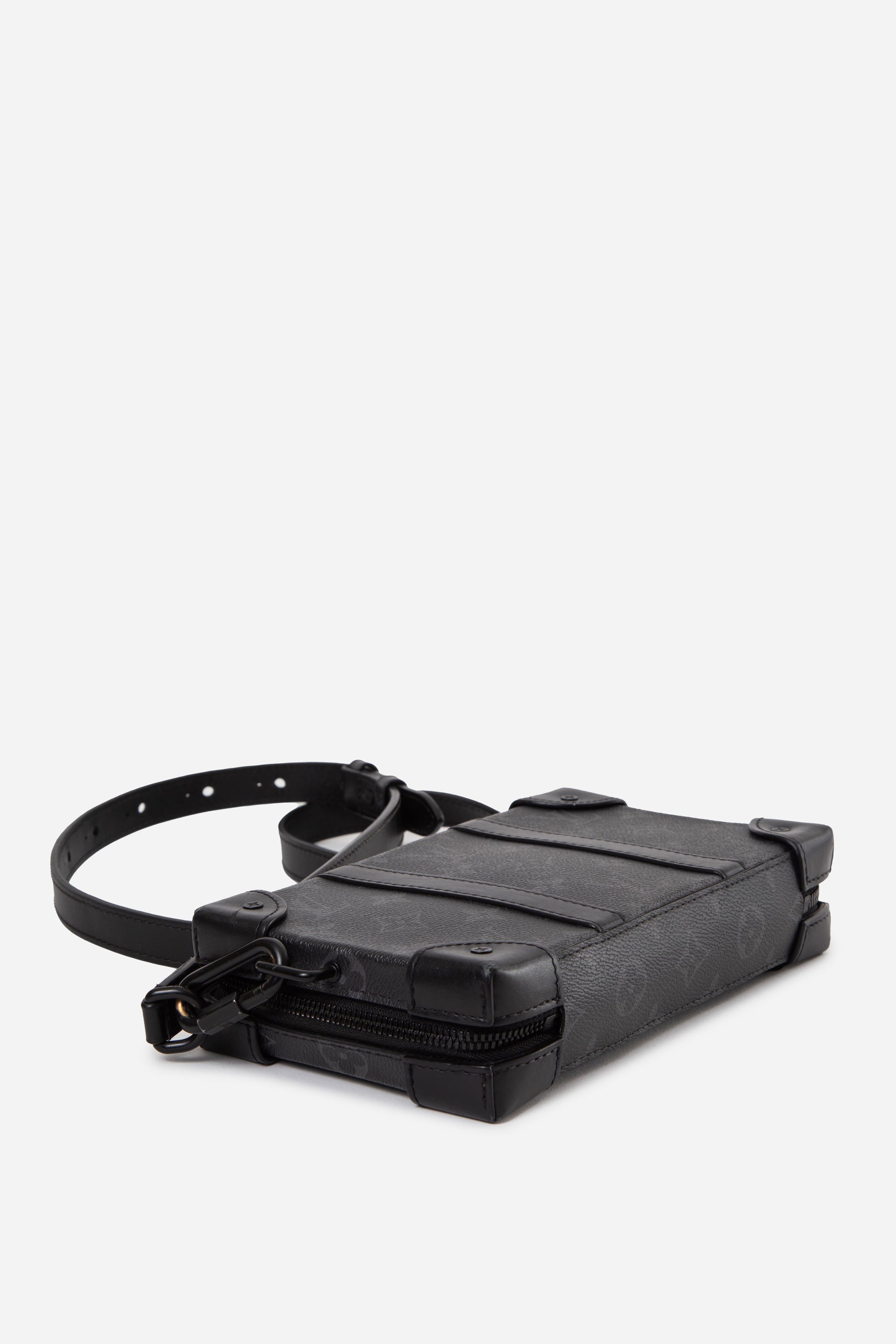 Discover the Louis Vuitton Monogram Eclipse Soft Trunk Wallet, featuring a structured trunk-inspired design with an adjustable shoulder strap for versatile wear. The exterior shows only light signs of use, while the interior remains clean with minimal wear. A modern and functional Louis Vuitton piece, authenticated by Entrupy.