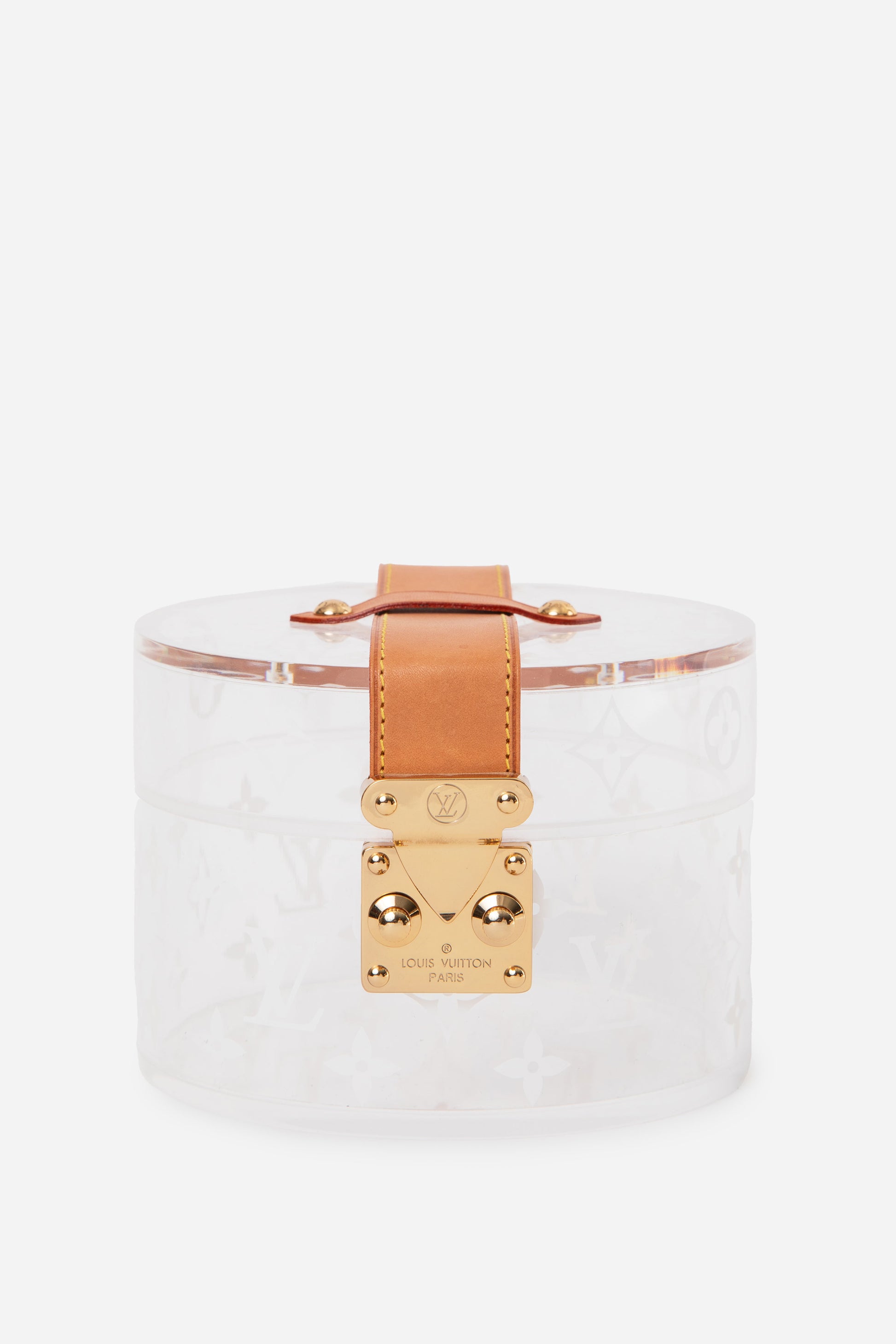 Discover this Louis Vuitton Scott Box crafted in clear acrylic, featuring a distinctive round silhouette inspired by classic hat box designs. The exterior shows normal signs of daily use, with light scratches on the bottom consistent with regular handling, while the interior remains clean and well preserved. Comes with an Entrupy Certificate of Authenticity, making it a unique and collectible Louis Vuitton piece.