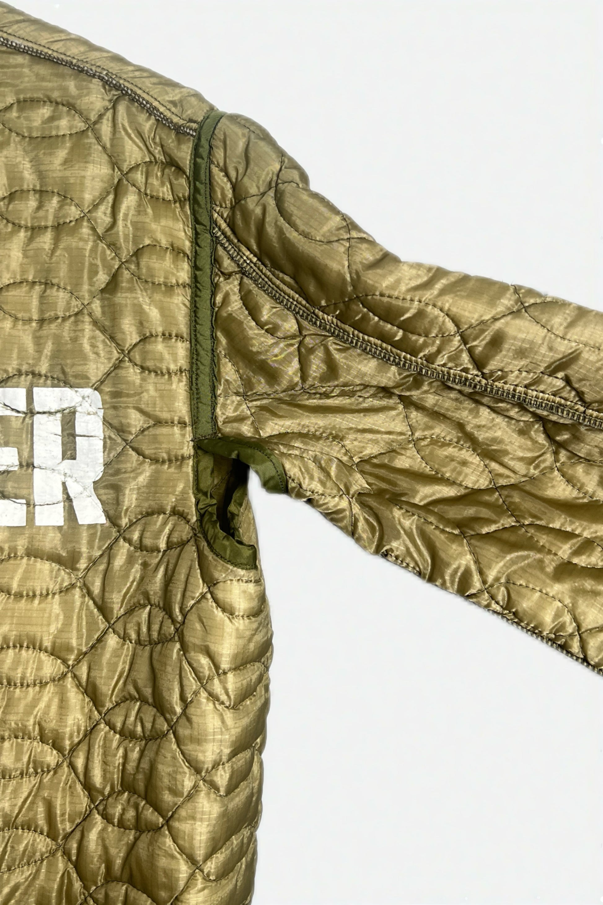 The jacket shows signs of wear, with creases on the exterior and interior lining.