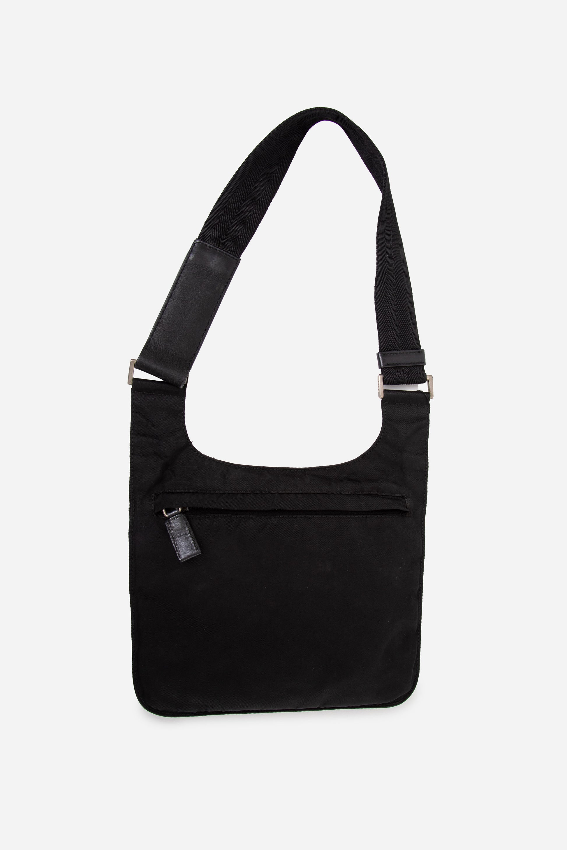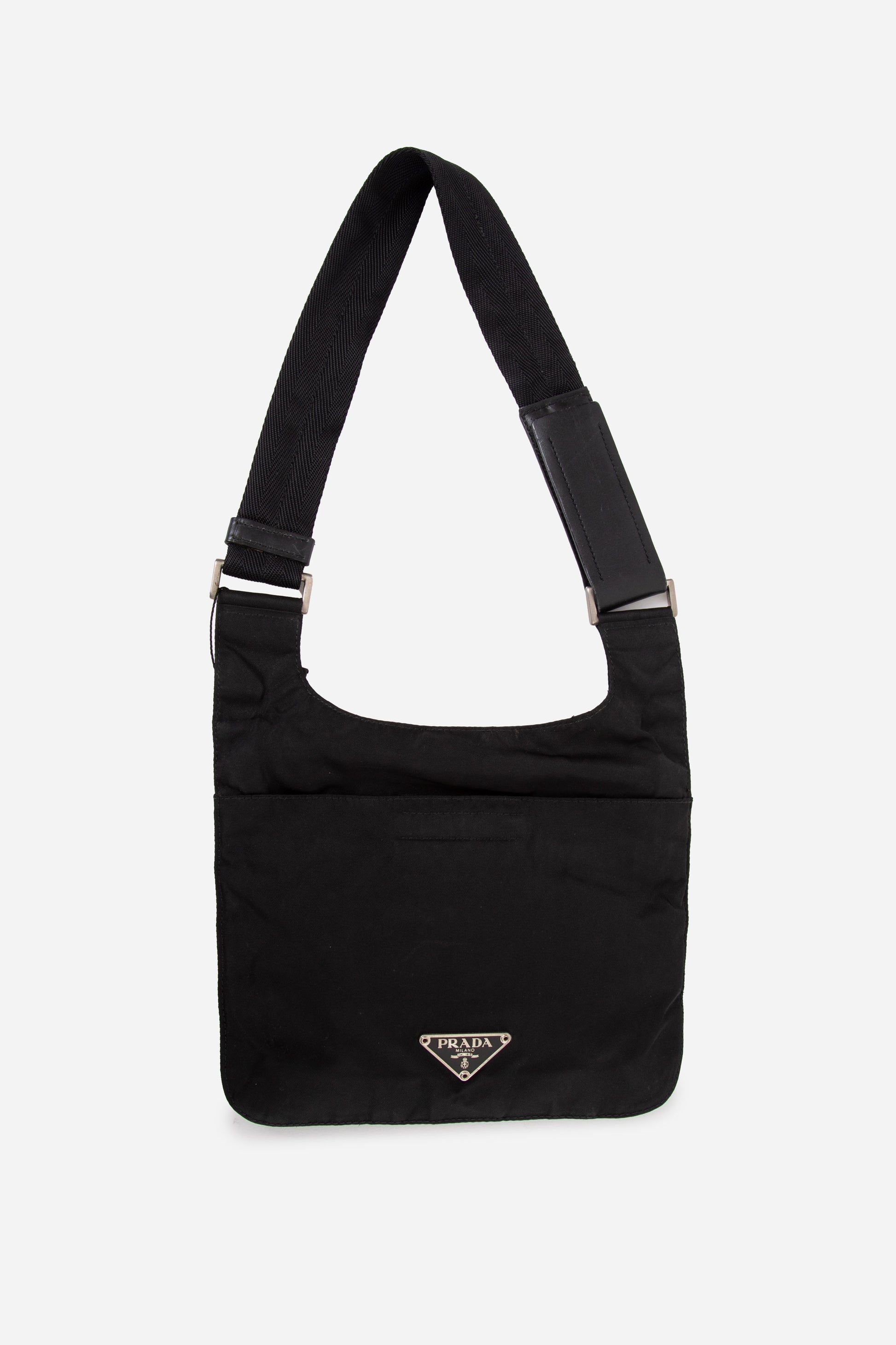 Discover this Prada Tessuto Nylon Shoulder Bag in black with silver-tone details. The bag is in good condition with normal signs of use, including minor loose threads along the edge, while the interior remains clean with minimal wear. Comes with an Entrupy Certificate of Authenticity.