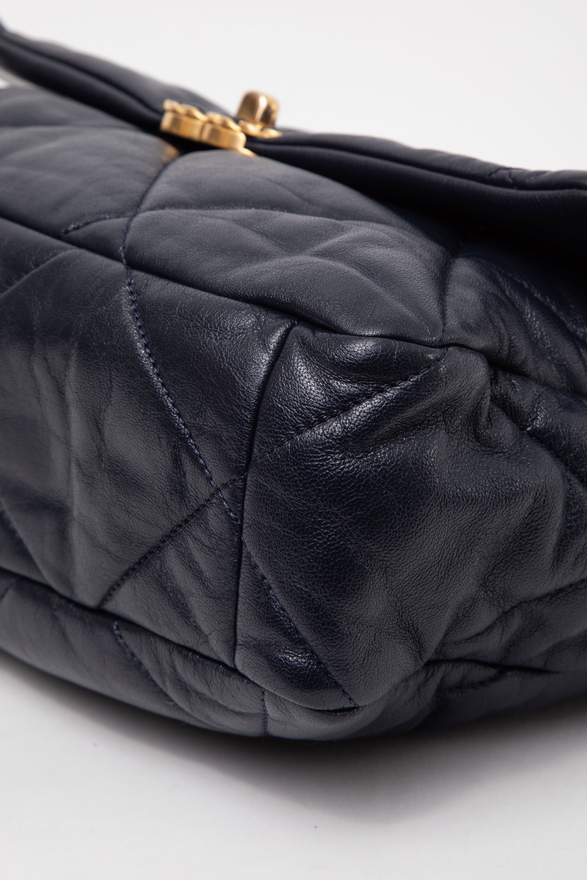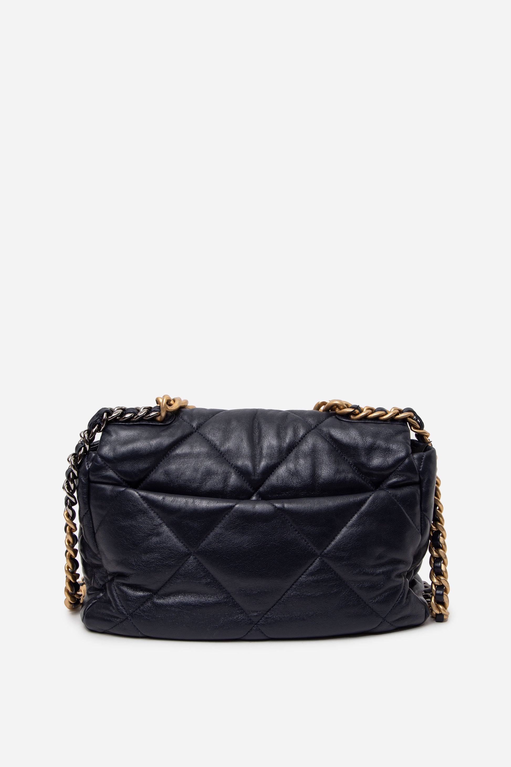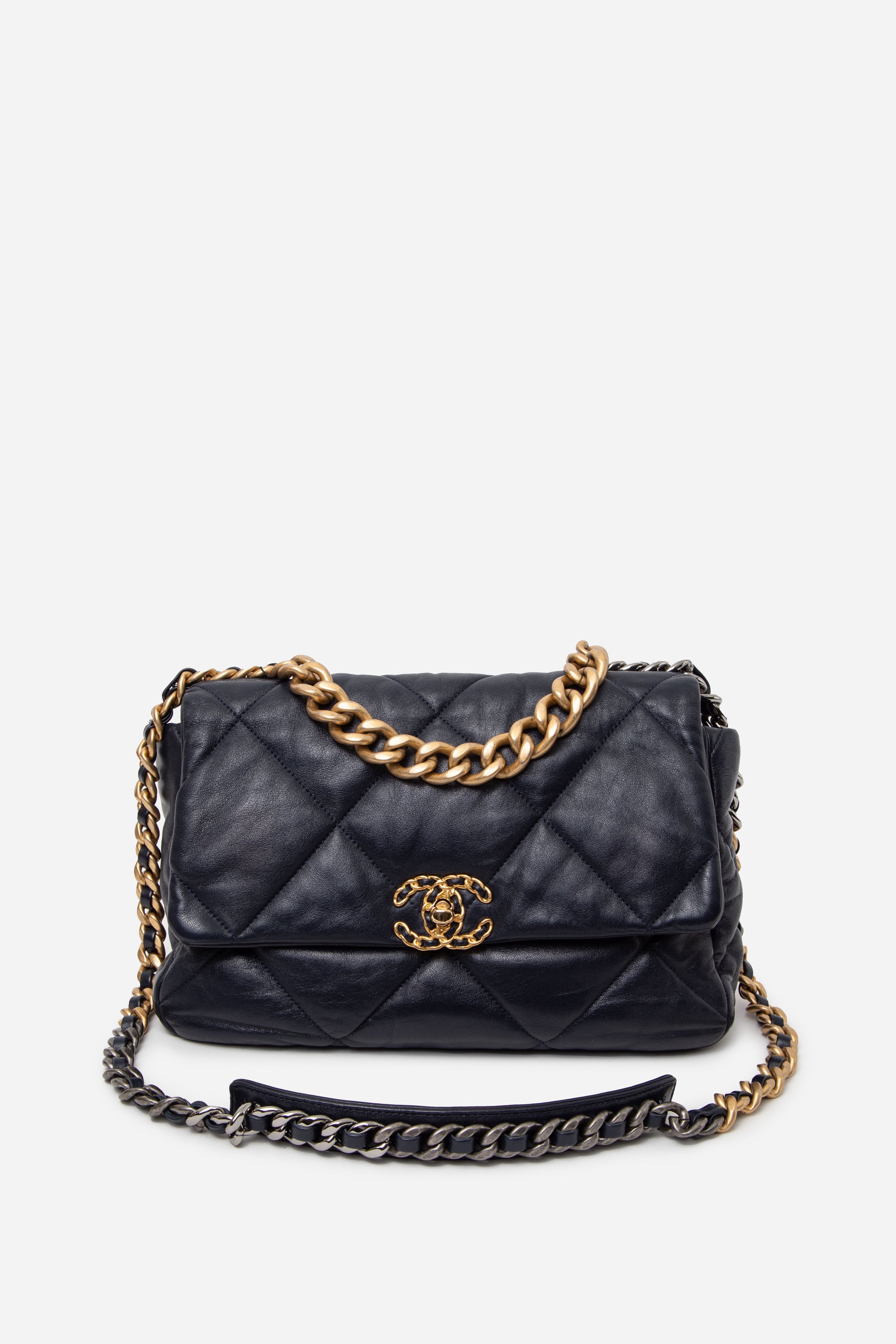 Discover the 2020 CHANEL 19 Bag in classic Navy Lambskin, prized for its soft, supple finish and iconic chain design. This pre-owned bag shows light signs of use on the exterior with a clean, well-maintained interior, making it an elegant everyday bag and a highly sought-after classic.