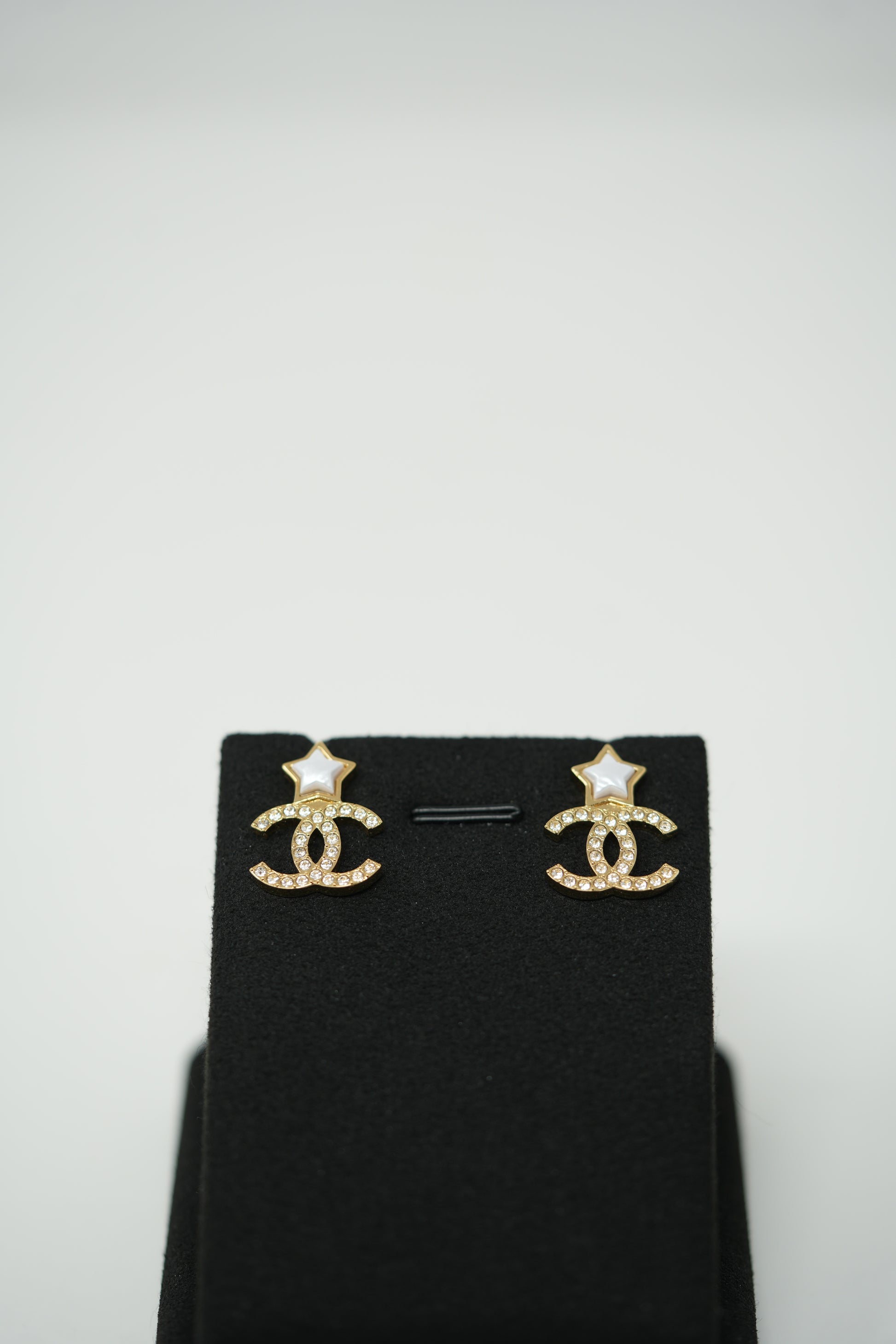 Pre-owned Chanel Crystal Pearl CC Star Earrings