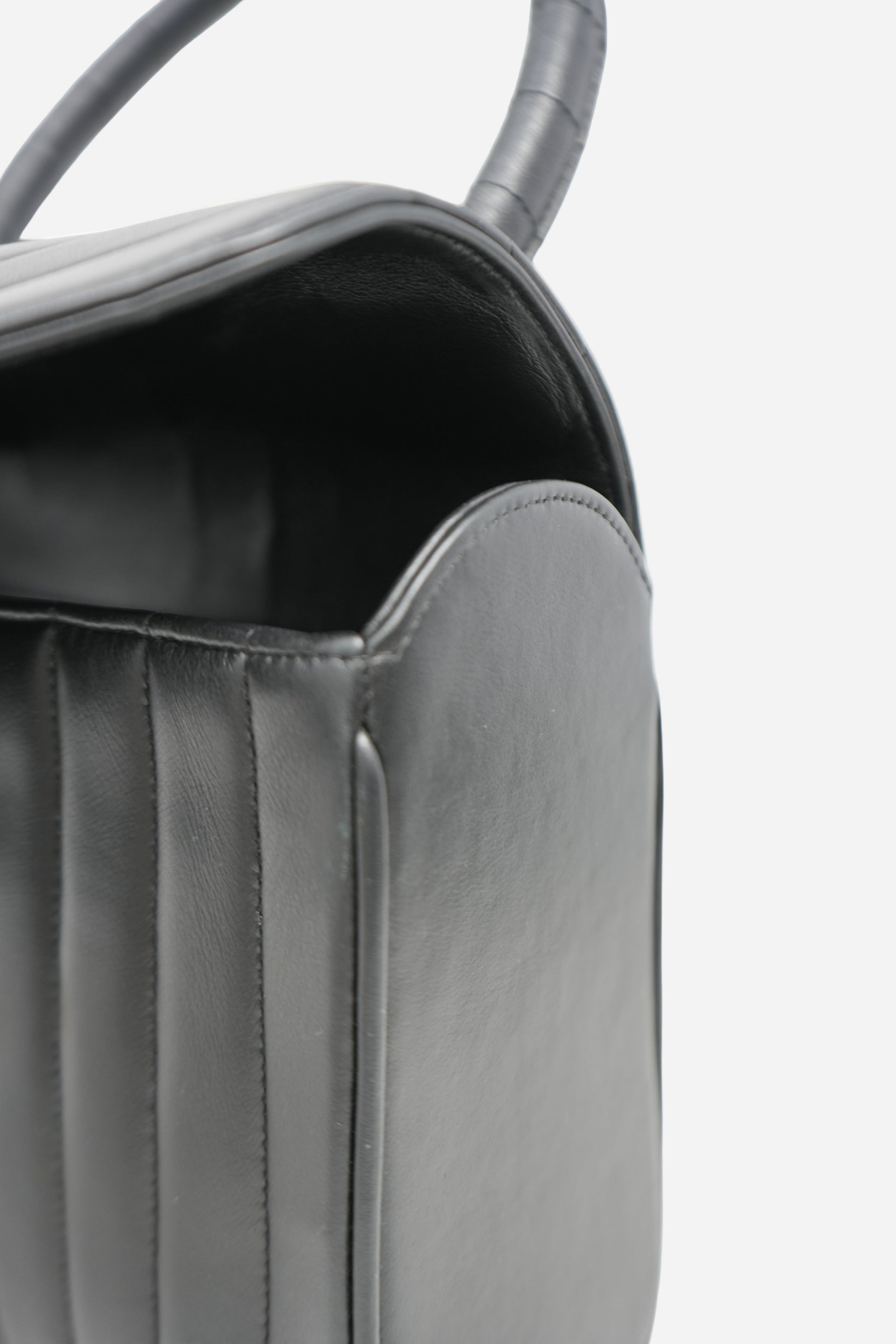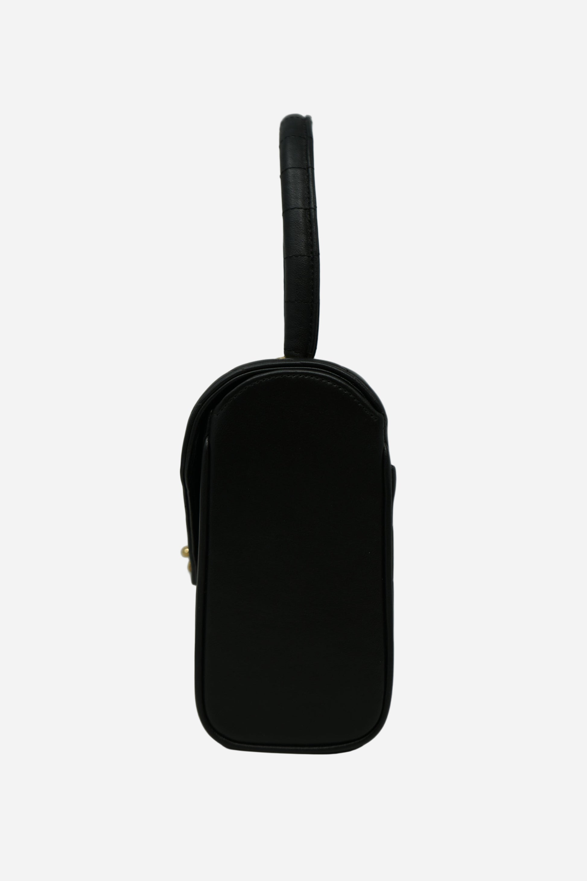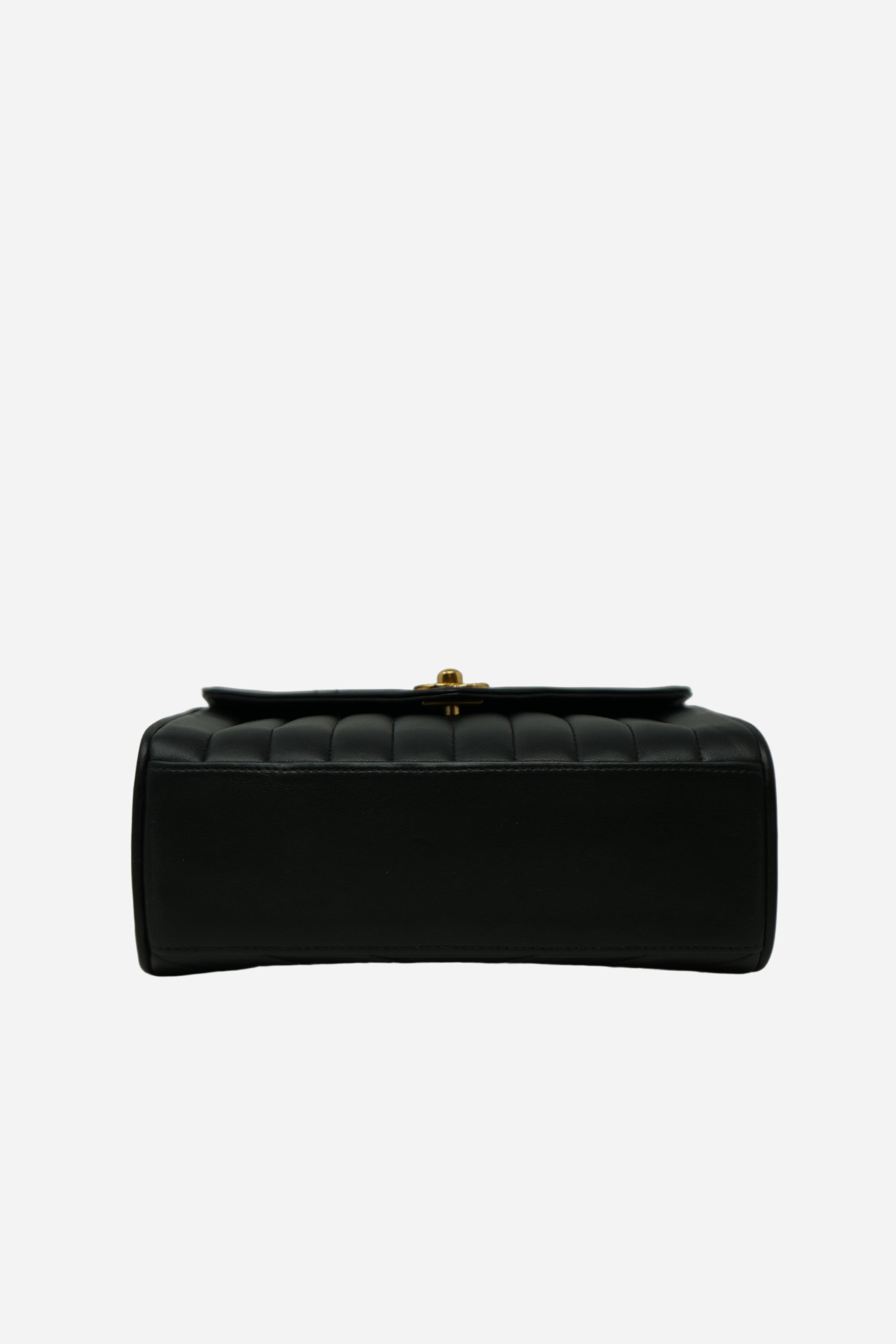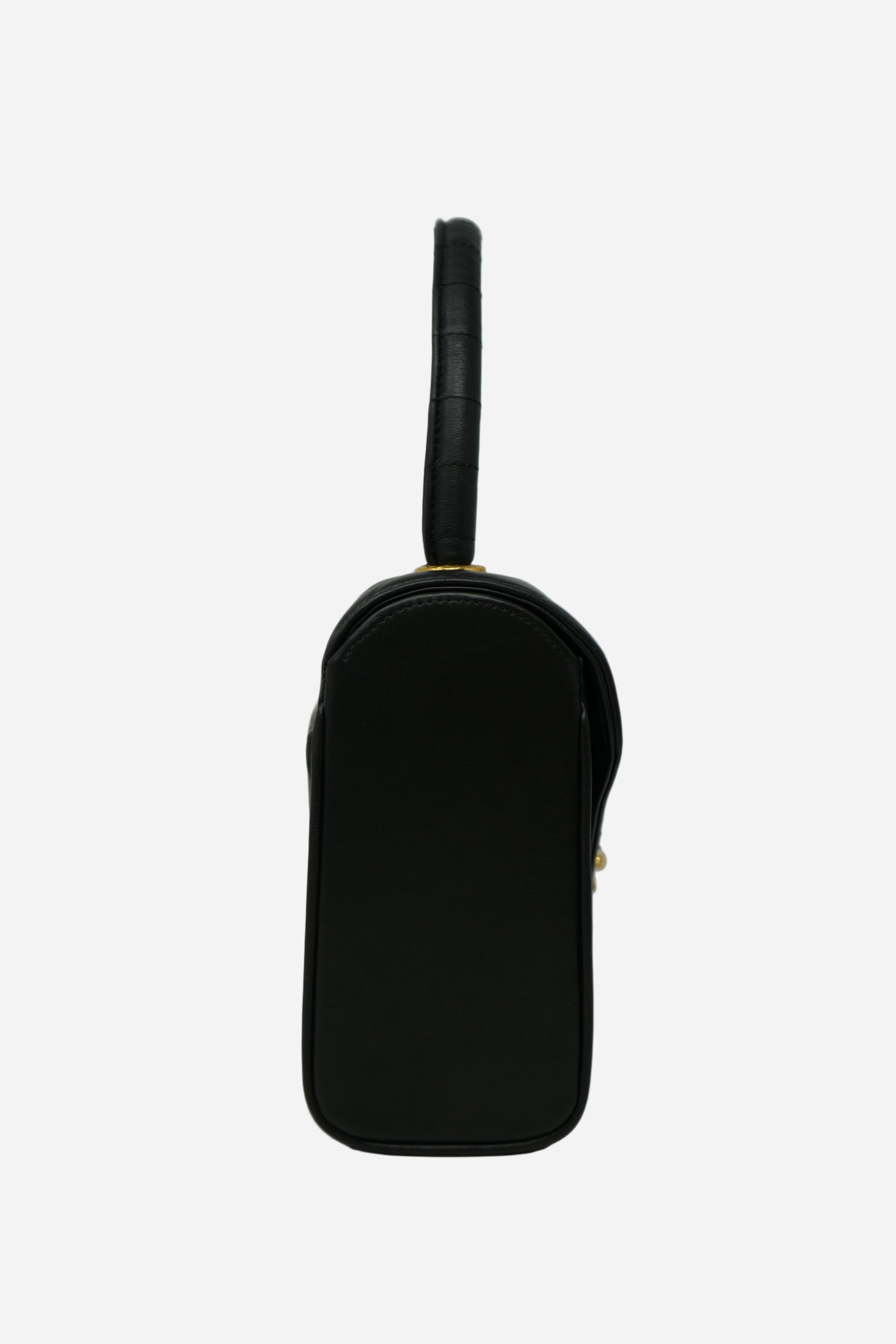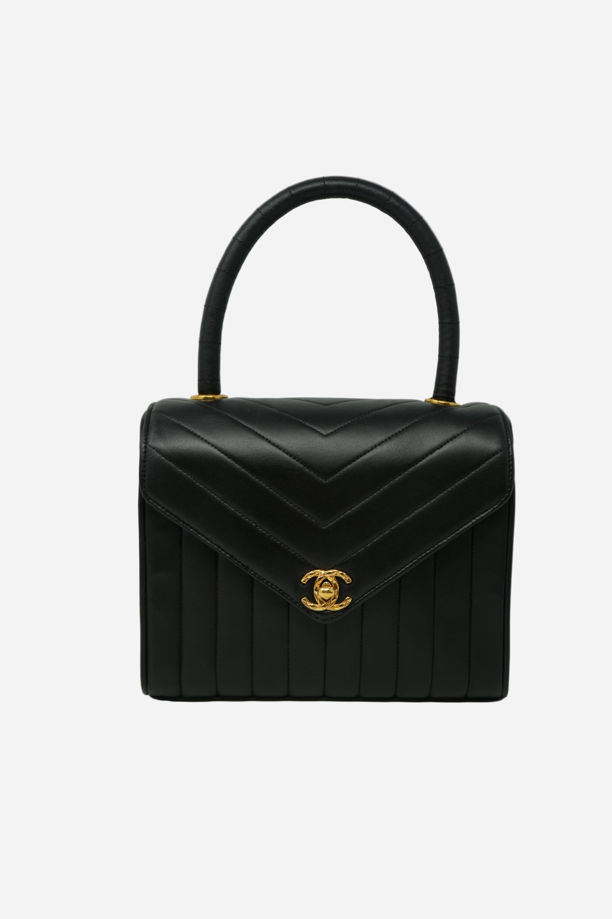 Discover this 1989–1991 Chanel Chevron-Quilted Mini Top Handle Bag in classic black lambskin. The soft lambskin pairs with gold-tone hardware and a structured mini silhouette for an elegant, versatile look. Chevron quilting and the top-handle design add a distinctive collectible touch. Comes with its original card and an Entrupy Certificate of Authenticity. In good pre-loved condition, with natural creasing on the flap and interior, and professionally retouched color on the exterior.