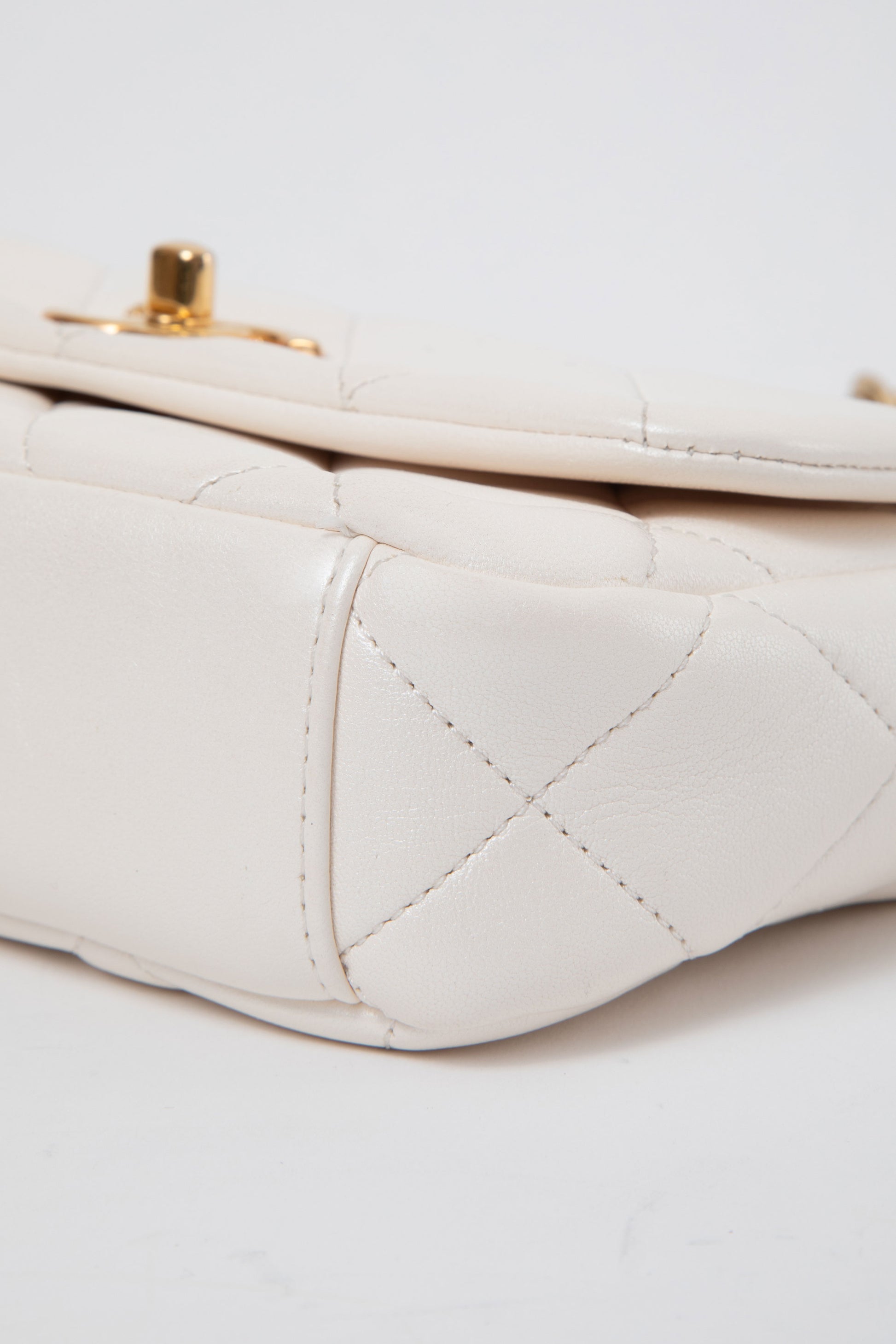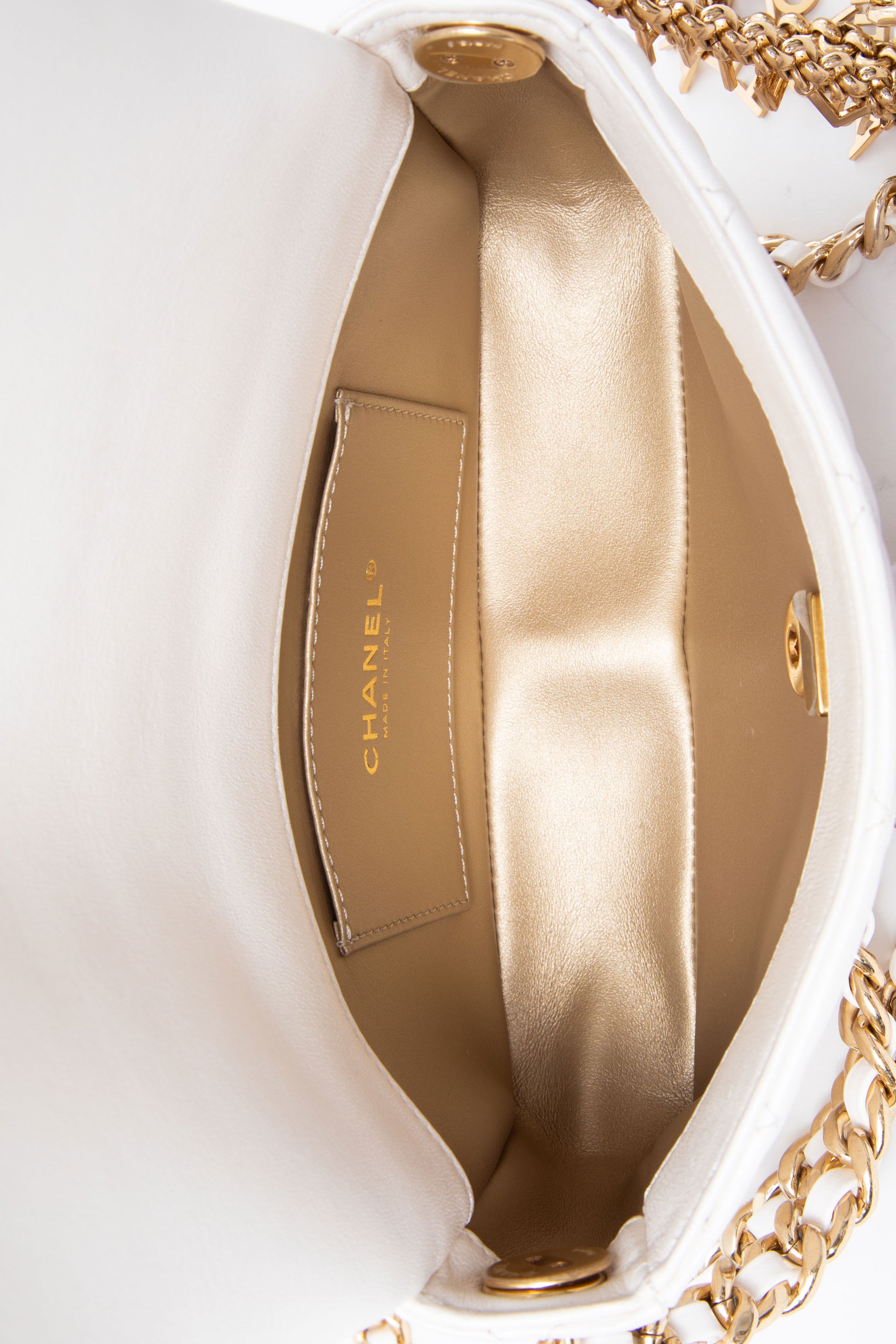 Discover this Pre-Owned Chanel 2024 Lambskin Quilted Logo Chain Mini Flap Bag, crafted in soft white lambskin with gold-tone hardware. The exterior remains in good condition with only slight signs of use, and the hardware shows minor wear. The interior is clean with light signs of use. Includes Entrupy Certificate of Authenticity.