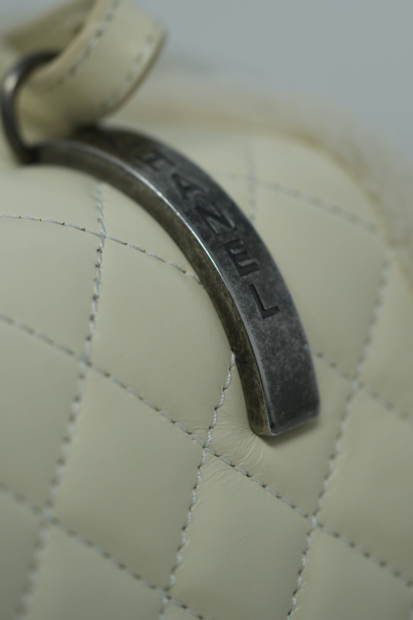 Discover this 2015–2016 Chanel Salzburg Backpack crafted in white shearling and calfskin from the Métiers d’Art Salzburg collection. The exterior shows signs of use on the leather, wear on the strap, and some hardware oxidation, while the interior remains in good condition with creasing on the inside flap. Complete with its original card and an Entrupy Certificate of Authenticity, this pre-loved piece offers unique character, collectible appeal, and practical versatility.