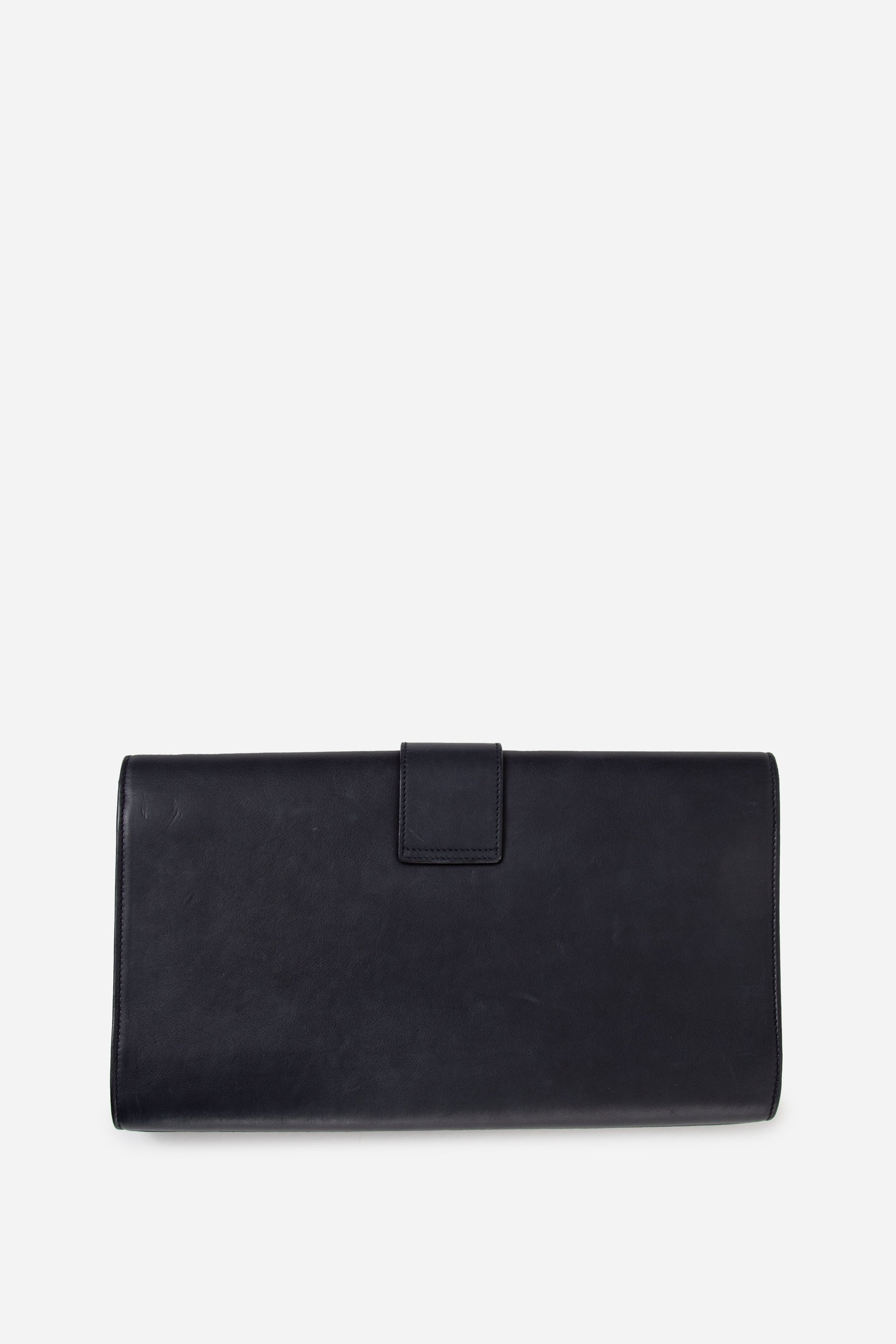 Discover the Yves Saint Laurent Y-Ligne Clutch crafted in black leather, featuring a sleek envelope-style silhouette. The exterior shows noticeable nail scratches and normal signs of use, while the interior remains clean and well kept. A classic Saint Laurent clutch, authenticated by Entrupy.